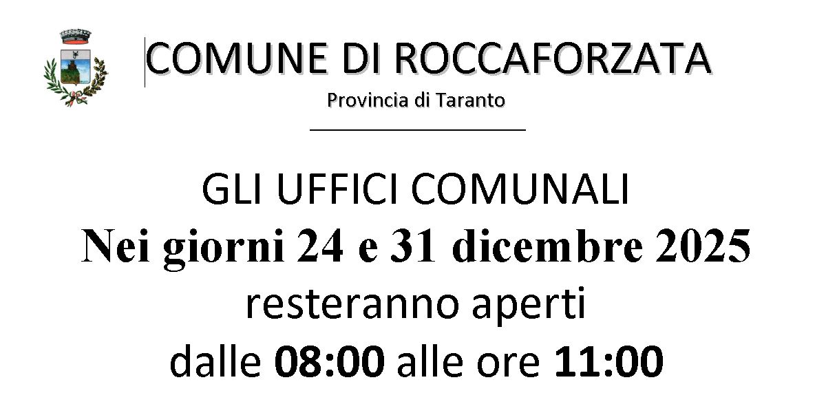 Descrizione GLI UFFICI COMUNALI Nei giorni 24 e 31 dicembre 2025 resteranno aperti dalle 08:00 alle ore 11:00