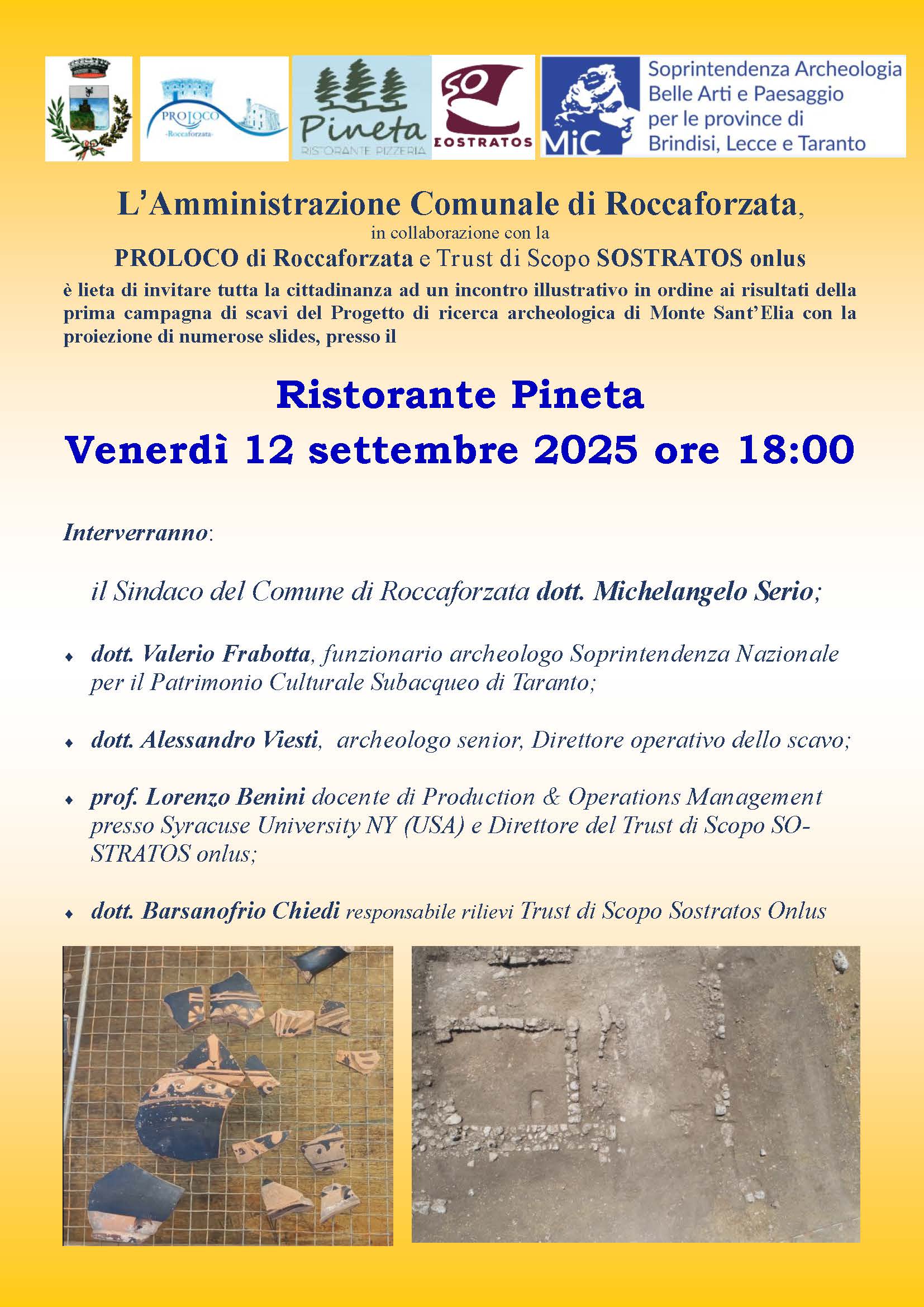 incontro illustrativo in ordine ai risultati della prima campagna di scavi del Progetto di ricerca archeologica di Monte Sant’Elia con la proiezione di numerose slides Ristorante Pineta  – Venerdì 12 settembre 2025 ore 18:00
