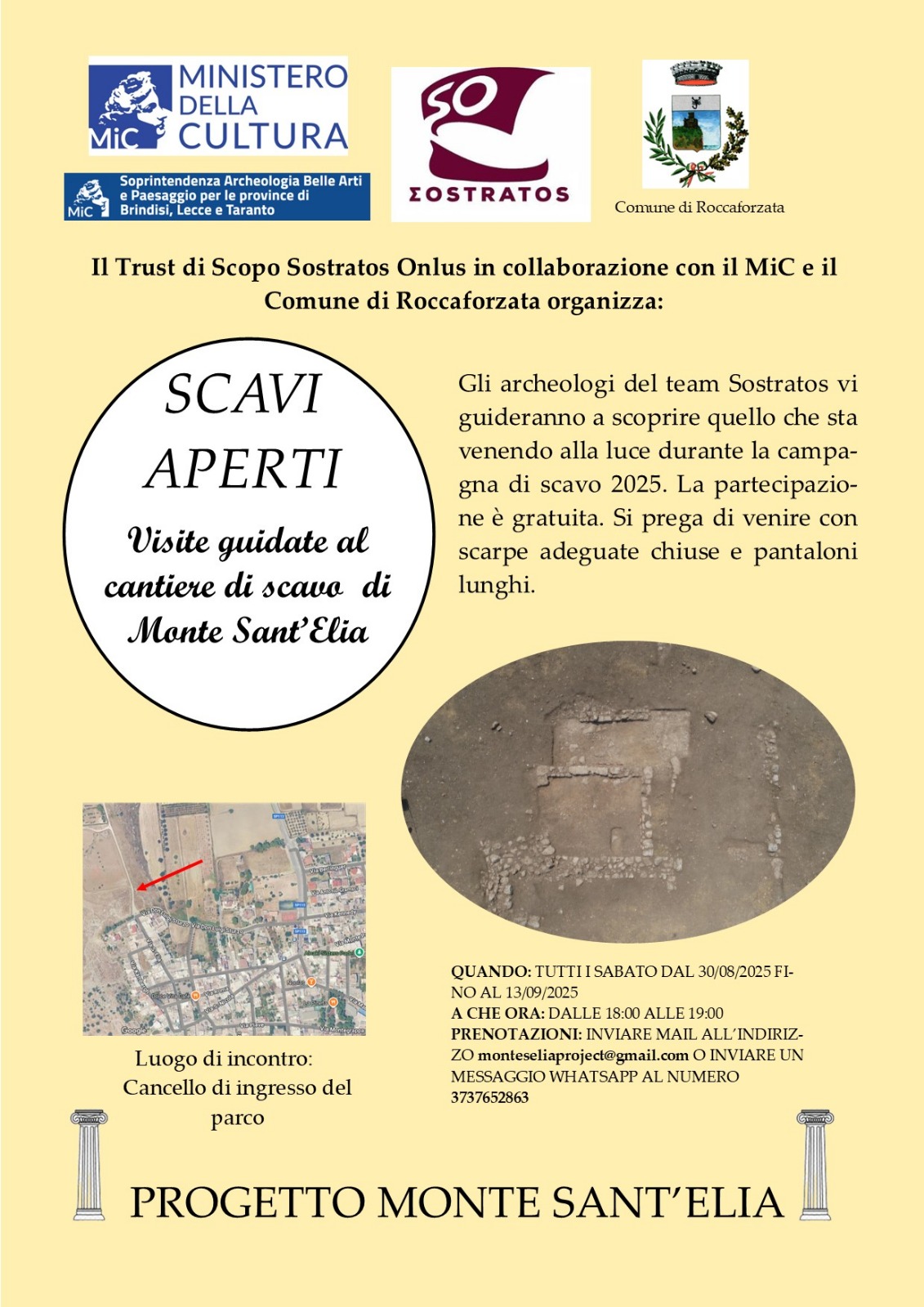 Il Trust di Scopo Sostratos Onlus, in collaborazione con il MIC e il Comune di Roccaforzata organizza una serie di visite guidate al cantiere di scavo di Monte Sant’Elia. Gli archeologi del Team Sostratos guideranno i cittadini alla scoperta degli scavi in scavi e di quanto sta venendo alla luce.